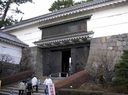 学橋を渡って城内にはいり、坂を登って再建された常磐木門をくぐれば本丸跡である。