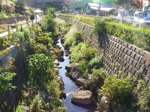 しばらく歩くと右手に法安寺がある。檀家以外は立ち入り禁止。複雑な笠間交差点をすぎると鼬(い たち)川にかかる新橋(にいばし)に至る。この橋の袂でおにぎりとアンパンの昼食とする。