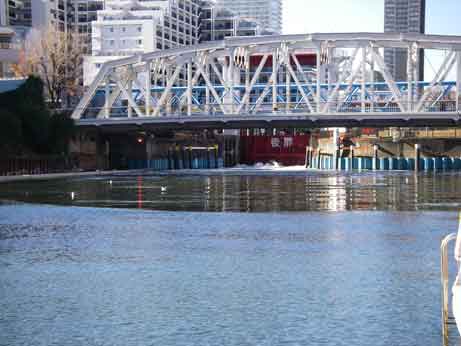 突き当りを左折すると中川大橋がみえ、その前にスカイダックという水陸両用バスがスロープから旧中川に入り、水の中を一周するトーキョー・スプラッ