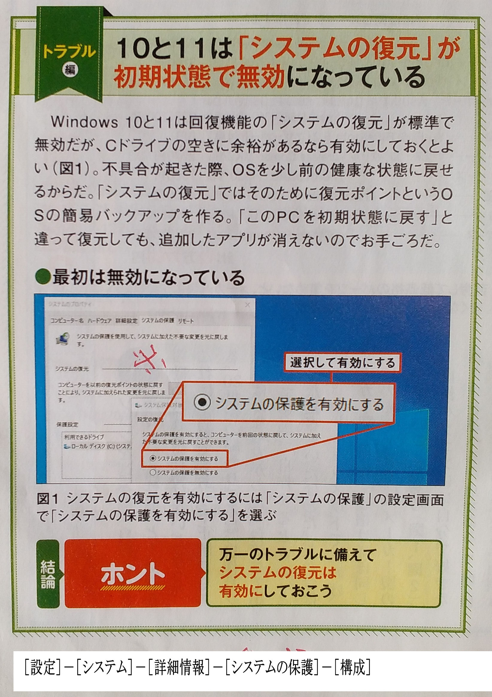 [設定]-[システム]-[詳細情報]-[システムの保護]-[構成]の順にクリック