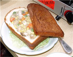 棺材板は台南の名物屋台料理です。 写真を見てわかるようにこれはパンコキールのアレンジです。 パンも普通の食パンより良いものを使っているようで台南の元祖の店よりずっとおいしゅうございました。 でもやはり、台菜としては邪道かなー。 お腹も膨れるし・・・。