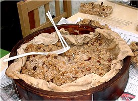 油飯は丁度蒸しあがったものをパックに詰め始めたので指差してみました。 これは子供が生まれた時にお祝いに作るものだそうで干蝦とスルメの香ばしい香りが嬉しいです。 スルメは日本のものではないようでかなり濃厚な香りを持っていて独特な風味をかもし出しています。 これは好評でお土産に買って帰った人もいます。