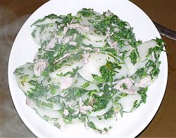 ところで宴会の菜譜ですが、まず前菜は蘇州の家庭料理から脆嫩蘿蔔絲と酒菜の二品を選択しました。 脆嫩蘿蔔絲は中華版大根サラダといったところであっさりしたしあがりになっています。 酒菜は野菜を紹興酒につけて作る一風変わった冷菜です。 陳皮、山椒などがアクセント加え複雑な味わいをかもし出しておりなかなかにいけてました。