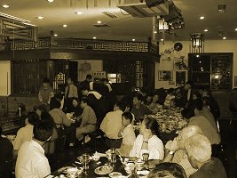 店に到着すると開放前の衣装に肩に毛巾(手ぬぐい)をかけたいなせなあんちゃんたちのお出迎えです。 席に案内されると肩にかけた毛巾でパンと埃を払いってくれます。 更に席につくと手練の技で折りたたまれた菜譜をテーブルの上にひろげ、この店の特色菜について要領良く説明してくれます。
