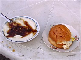 早点は朝6時からやっていますが店の前に屋台のようなものをしつらえてあり、作ってもらったものを屋外にあるテーブルへ自分で持っていって食べるスタイルになっています。 沙鍋[食昆]飩を作るコンロの横には香菜、辣椒、昆布のような海草、桜海老に近い干し蝦などの調味料が置いてあります。 これはコックが調理するときも使いますが客が好みで沙鍋[食昆]飩とか豆脳などにかけても良いようになっています。
