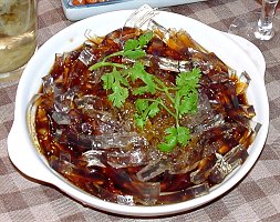 水晶魚凍は英語でFish Jellyと書いてあったにもかかわらず出てきたものはトコロテンの親戚のようなものでした。 黒醋で味付けした固めのトコロテンといったところでしょうか。 どう考えても魚は使われてはいないように思えるのですが謎ですね。 でもこういったものを食すと焼酎のお湯割を飲みたくなるのは私だけでしょうか。