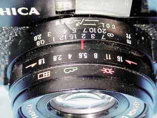 レンズを見る。 ヤシノン35mm f1、8で広角レンズである。 |