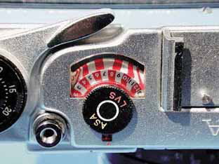 巻き上げ部から見る。 手動式Fフィルムカウンターと露出メーターがわかる。 |