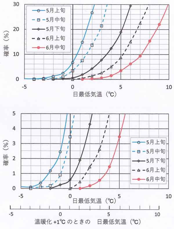 目次 213.1 まえがき 213.2 放射冷却と凍霜害(復習) 213.3 資料と解析 213.4 作物被害の限界温度の発生確率 日最低気温の頻度分布 低温の発生確率 温暖化の影響 他地域における低温発生の確率 まとめ 文献