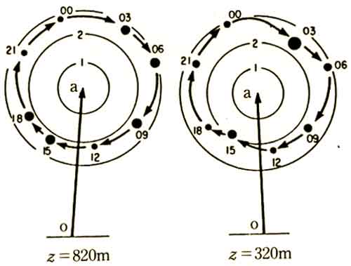 ベクトルの日変化である。長い直線矢印 o→a は日平均風のベクトルである。