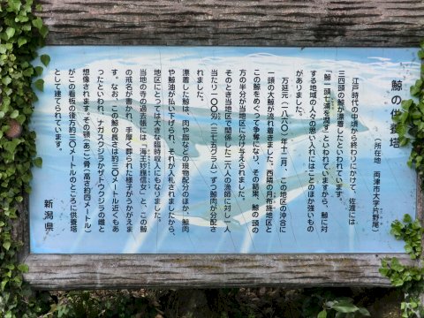 当地の寺の過去帳には「海王妙應信女」と、この鯨/の戒名が書かれ、手厚く葬られた様子がうかがえま/す。なお、この鯨の長さは約三〇メートル近くもあ/ったといわれ、ナガスクジラかザトウクジラの雌と/想像されます。その顎(あご)骨(高さ約四メートル)/がこの看板の後方約三〇メートルのところに供養塔/として建てられています。/新潟県