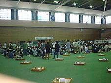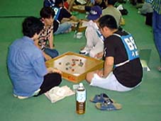 正方形の盤を用い、木製の円盤を指で弾いて敵方の駒を落とす遊び。