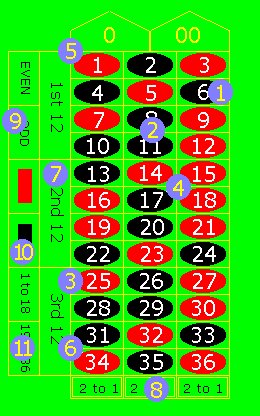 番号 賭け方 チップの置き方 配当 1 1点賭け 一つの数字の上に置く 36倍 2 2点賭け 2つに数字の間に置く 18倍 3 3点賭け 横一列の左端に置く 12倍 4 4点賭け 4つの数字の中央に置く 9倍 5 5点賭け 一番上の左端に置く 7倍 6 6点賭け 横2列の中央左端に置く 6倍 7 12点賭け(大中小) 1〜12,13〜24,25〜36の枠の一つに置く 3倍 8 12点賭け(列) 縦一列の一番下に置く 3倍 9 偶数奇数賭け EVEN(偶数)かODD(奇数)の枠に置く 2倍 10 赤黒賭け RED(赤)かBLACK(黒)の枠に置く 2倍 11 大小賭け 1〜18か、19〜36の枠に置く 2倍