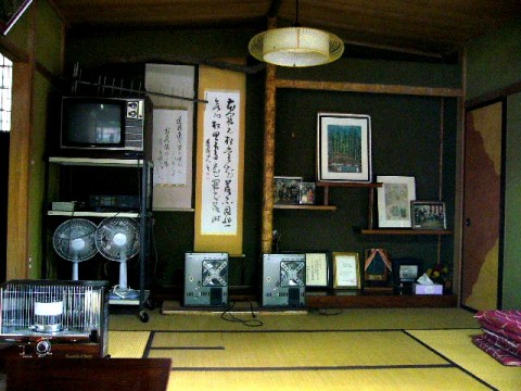 お茶講の家はバス停から3分ほどのところにあった。茅葺きの大きな家である。中では何人かの人間が囲炉裏に当たっている。上がり込んで火に当たらせてもらうと、地元の人のほかにも何人か見学にている人がいることが分かった。 地元の人に話を聞くと、お茶講は元々白久保の集落の家家の持ち回りで行っていたのだが、広い部屋を持つ家が少なくなったため、20年ほど前にお茶候の家を建てたとのことであった。