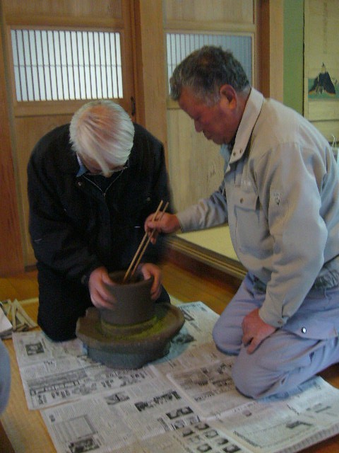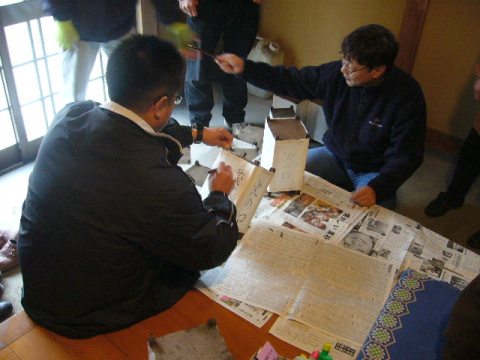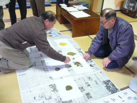 準備開始。持ち出されたのは煎茶、甘茶、ミカンの皮。これを焙烙でカラカラにして石臼で挽いて粉にする。できあがったものは和紙に取り、これから配合にかかる。スプーンである茶は煎茶3杯、甘茶2杯、ミカンの皮1杯、というように取り、4種類のお茶を作る。できあがるとそれぞれを3つに分ける。都合12に分け、これを一つ一つ畳んで包みにする。 一方では行灯作りだ。木枠に張った和紙に文字を書き今年用の行灯を作る。 3時、準備は一段落し解散。