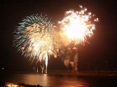 19:47 最初の花火が始まりました。 カメラは相変わらずPanasonic LUMIX DMC-FX01 花火モードで撮影。シャッター速度 1.0秒、F値 5.60 ISO感度 80 になっていました。 |