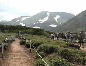 黒岳9合日のハイマツ帯の斜面を一気に抜けるとそこはもう黒岳山頂です。ぱっと開けた眼下に神々の遊ぶ庭(カムイミンタラ)とお鉢平(中央火口)、そこから黒岳左側にまっすぐ伸びてくる赤石川が見えます。 お鉢平の少し右の山に大きな雪渓が見えます。これが有名な白鳥と千鳥の雪渓をもつ北鎮岳です。 北鏡岳は、中央火口を取り巻く一番外側の外輪山(古大雪火山)の一つでそこから黒岳のほうへ凌雲岳、桂月岳と連なっています。 眼を左側の監視小屋から赤石川を通り越し、がれ場のむこうを見てみましょう。独特の形をした 烏帽子岳が見えませんか。浅野匠の守や 大岡越前の守が被っていたあの烏帽子です。どうです、見つけられたでしょう。その後ろが赤岳、時計回りに小泉岳、白雲岳と続いています。小泉岳は、なだらかな山なので見落とすかも知れません。これらの山々の内側にあってお鉢火口を取り巻く山(新大雪火山)は、前方少し左の赤石川の向こうから奥のほう時計回りに北海岳、松田岳、荒井岳、間宮岳、中岳とみることができます。又、黒岳からお鉢火口、間宮岳を結んだ向こうに大雪山の主峰旭岳が見えます。双眼鏡で覗いてみると山項にいる人を見ることもできます。