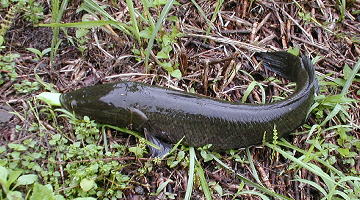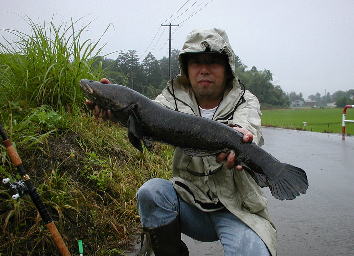 道によって池から切り離された、5m四方の水溜りを何気なく覗くと、70cm弱の雷魚が居た。