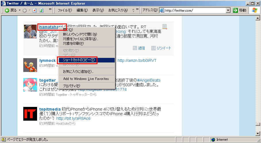 IEでTwitterを見ている場合の例です。会話をチェックしたい人の「ユーザー名」を右クリックして、