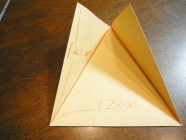 @封筒の下側の長さを定規で測ります。その長さが12pだったら、正方形にする形の高さを12pにしてはさみで封筒を切ります。 A切った正方形の封筒に三角形を描きます。真ん中の写真のように、上の12pの真ん中の6pの所に印を書き三角形を描きます。 B定規を使って三角形の斜めの線のところを両方とも折ります。 D封筒の横にハサミで小さな半丸を切ります。ここが空気を吹き込む穴になります。 E封筒を開くとテトラポットを開いたような形になります。 F開いた口をセロテープで閉じます。ソロテープで貼るときには、セロテープをテーブルの上に置いて、封筒の貼りたい口のところを押し当てるとうまく貼れます。セロテープで口のところが閉じられたら完成です。穴から空気を吹き込んで紙風船のできあがりです。 |