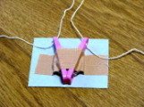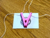 | 登るおもちゃは、昔からあるおもちゃです。木で作られているものでは、木に2カ所穴をあけてあります。10数年前に木で作ったことがありますが、穴をあける道具が必要だったりと、誰でもすぐに簡単に作れるものではありませんでした。 その後、木の代わりに厚紙とストローで作るものが主流になったのですが、今回のものはストローの代わりにどこの家にもあるプラスチックの洗濯ばさみを使ったものです。 これは、仮説社の「ものづくりハンドブック」に紹介されたものです。ストローで作るよりももっと楽ですよ。割り箸がない場合は、ひもの両端を両手で持って交互にひもを引いていきます。割り箸がついていると片手でも大丈夫です。材料さえあれば、10分くらいでできます。 |