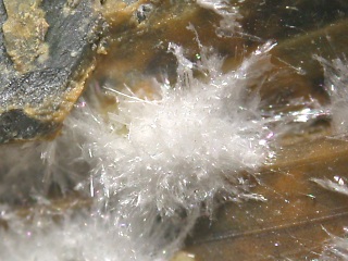 黄安華に変化した輝安鉱の表面に放射状集合体として観察できます。