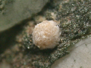 この産地では水晶や長石上に白色から淡桃色の半球状をした