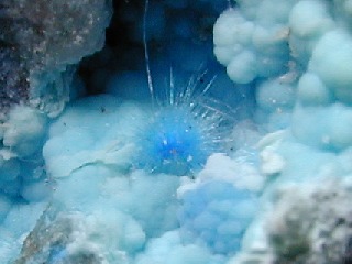 明るい青色をした針状結晶がハイダルカナイト(カイダルカナイト)です。