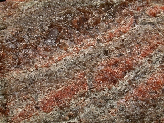 赤色のシルビン(Sylvite)や茶色の岩塩(Halite)と層をなしています。