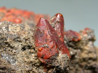 紅色をした六角錐状の結晶が紅亜鉛鉱です。