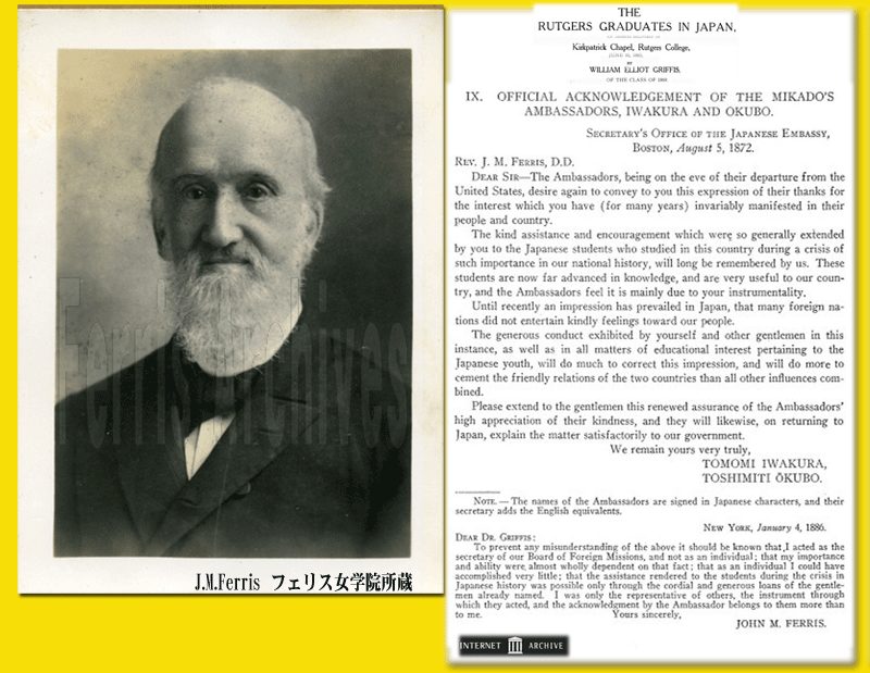 一八七一年一一月二一日江戸J.M.フェリス師宛書簡「全権大使一行はサンフランシスコに向けて十二月二十二日に出版する予定です。大使一行の長は龍と旭(ニューブランズウィック留学中)の父親です。日本帝国の総理大臣(岩倉卿)で最も権力のある人物です。この使節の派遣は永年にわたり、熱望しているキリスト教信教の自由をもたらすかもしれず、あるいは少なくとも、それに近づくのに大いに役立つかもしれないと言うのが私の希望であり、祈りであります。」