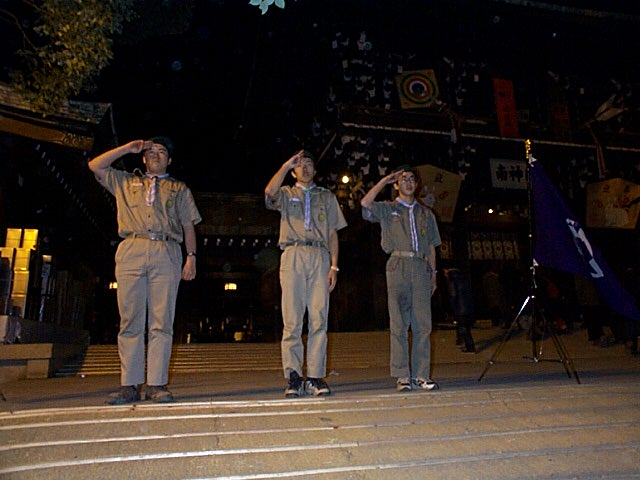 去る1998年12月31日、我々ボーイスカウト渋谷5団は、明治神宮へ初詣奉仕へ 行って参りました。(初詣奉仕とは、明治神宮へ初詣へ来られる方々の整備、安全確保をすることです。)さて、この初詣奉仕、我々ベンチャー隊にとっても試練なのです。何故かと申しますと、我々の活動は初詣客の方々の整備なのです。故に必然的に外気に触れることになります。我々の制服はTシャツに長ズボン。この破滅的な寒さは尋常ではありません。1時間サイクル20分交代とはいえ、なかなかの修羅場です。そんな地獄絵図の様な状態の我々を励ましてくれるのが初詣客の方々です。「がんばってください。」 「大丈夫ですか?」等と言われますとこちらも勇気付けられるものです。そのお陰で無事落伍者もなく、活動を終えることが出来ました。本当に皆さんどうもありがとうございました。