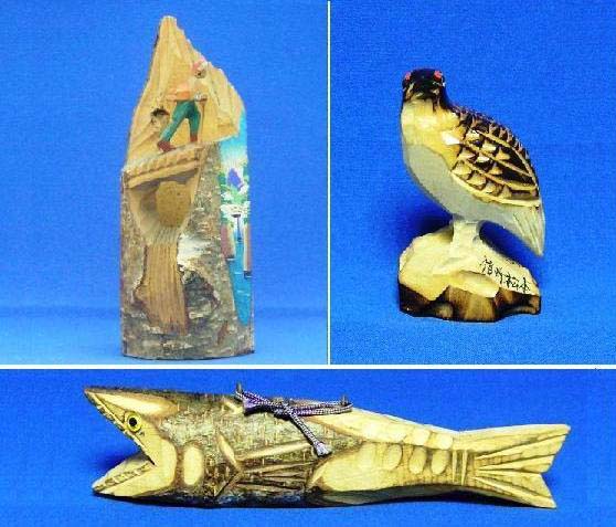 ![]() 長野県は山間地の豊富な木を材料として、家具などの木工品や皿・菓子器などの工芸品の生産が盛んである。また、郷土玩具にも木を使ったものが多い。そこで忘れてならないのは大正期に版画家・山本鼎(かなえ)が指導した「農民美術運動」の影響である。農閑期を有効に生かし農家の生活を安定させることを目的に県内全域で行なわれたこの活動では、生活に密着した郷土性と素朴な美を求めて多様な木彫産品が創作された。木端人形、松川人形など姿を消したものもあるが、現存する風俗彫刻(登山人形など)や動物彫刻(雷鳥や岩魚、ほかにカモシカや猿など)、はす切り彫刻、遠近農家額縁などはその流れをくむものだろう。雷鳥は国の特別天然記念物に指定されている長野県の県鳥である。材料は信濃の語源ともなったシナノキ。登山人形の高さ13cm、雷鳥の高さ8cm、岩魚の長さ18cm。(H23.1.29)