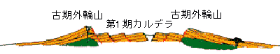 | 第1期(C) カルデラの形成後しばらくは火山活動が沈静化した期間があり、カルデラ壁は浸食されて外輪山が拡大しました。ボーリング調査によって、もとのカルデラの外縁は現在よりも2〜3km内側にあったことが確認されています。 |