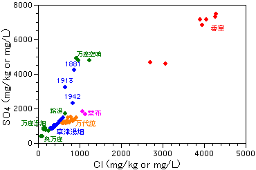 | 三角図の下半分を切り抜いた格好になってます。三角の頂点に近いほどその成分が多く、真ん中あたりでは3成分が均等に含まれているっていうことになります。 草津湯畑と万代鉱は径年変化が大きいので、複数年次の測定値をすべてプロットしてあります。細かくなるので年次は表示していませんが、おおむね左上ほど古く、右下ほど新しい年次になっています。つまり、これらの温泉は、昔は香草や常布と非常によく似た成分比のものであったものが、近年は次第にNaとKに富むような泉質に変化してきているということです。前の章では、湯畑の泉質が変化してきているのは万代鉱源泉の一部が地下で湯畑源泉に混じってきているのではないかと推測されていると書きましたが、両者が接近しつつある傾向は確かにありますが、どうやら万代鉱じたいの泉質も変わってきているように見えます。 図の左下側のカルシウム(Ca)が多い領域には、湯釜・奥万座・石津坑といった温泉が位置しています。岩崎(2001)の実験的研究では、酸性溶液を新鮮な岩石(火山岩)に接触させると、溶かし出す成分のはじめはカルシウムに富むタイプになり、岩石の変質が進んだ後ではナトリウムに富むタイプになると述べています。これだけでは決め手に欠けますけども、これらの温泉にカルシウムが多いのは、どうやら温泉と岩石の接触時間が短い、つまり、比較的浅いところで作られているらしいことが想像できます。具体的には、これらの温泉は硫化水素(H2S)を多量に含む酸性の噴気が、表層水に吹き込んでできているとみられます。 万座温泉は、陽イオンの主成分がマグネシウム(Mg)の、いわゆる正苦味泉(Mg-SO4)という全国的にも珍しい泉質であることが特徴です。Mgの成分比率は最大で42.96mval%(ラジウム北光泉・松屋ホテル)にも達します。それに対して、鉄やアルミの含有量はあまり多くありません。原因はよく分かっていませんが、これには地質が関係しているようにも思えます(次章)。 万座のなかでは、空噴・鈴湯(地熱)・苦湯といった小規模源泉よりも、万座湯畑(姥湯)のような湧出量の大きい源泉の方がカルシウムの比率が増す傾向があります。また、図上で、万座湯畑は、空噴と奥万座を結ぶ直線上に位置しているようにみえます。小坂(1984)はこれについて、万座の各源泉は、空噴、奥万座、降水(地表水)の3者がいろんな比率で混合してできあがっていると考え、各源泉の混合割合を試算しています。空噴は万座地域でもっとも成分量の多い源泉なので、万座の温泉の「素」とみられています。 もうちょっと詳しくみてみましょう 下図は、陰イオンのうちの主成分、塩化物イオンと硫酸イオンの比率をみたものです。右上ほど濃く左下ほど薄いという関係は最初の図と同じですが、ここでは酸性泉の「酸」が塩酸型(HCl)か硫酸型(H2SO4)かという性質がわかります。これでみると、1) 東麓の温泉、香草・常布・万代鉱・草津湯畑(近年)はほぼ一直線にならび、酸の性質が似ている、2) 万座空噴・鈴湯・万座湯畑・奥万座もほぼ一直線にならび、酸の性質が似ている 3) 万座は東麓の温泉群よりも塩酸成分が少ない傾向にある、4) 過去の草津湯畑は万座の傾向に似ていたらしい。(ただし他の温泉は古い分析値がないので単純には比較できない)。 これからいえることは、万座・東麓の温泉ともに、なにか成分の濃い「温泉の素」がそれぞれにあって、どこかで薄められながら湧出してきているらしいということです。 |