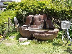 ■山口温泉 いわずと知れた山梨の有名かけ流し湯。みしゅらんあり。番頭さんもみえられてますね。甲府昭和ICより約5分ですが、住宅地の中にありわかりにくいのでHP参照必須です。農家の庭先のようなのどかな佇まいで、ニワトリの声がきこえます。玄関前に飲泉があり、早くもその豊富な湯量をうかがわせます。料金を払った人が有名な番頭さんでした。 浴室は内湯(岩+石造、10人)と東屋つきの広い露天(同、12人)で脱衣場経由ハダカ移動可。内湯、露天とも源泉100%非加熱非加水かけ流しです (完璧 ^^)。 湯船まわりの岩は赤褐色に変色しています。 内湯は岩の湯口(龍の口)から100L/min近くをドバドバと大量注湯で飲泉可。ややぬるめで2ケ所から大量オーバーフロー。シャワー付カラン5、ドライヤーあり。 露天は、筒状の石の湯口2本から潤沢な注湯があってやはり飲泉可。こちらはさらにぬるめのお湯を湯船のはしから小川に大量放流しています。(小川には緑色のコケがびっしりでなぜかいい感じ出てます)5/2昼で男湯2〜4人、女湯独占と空いてました。 お湯は、淡緑黄色透明、細かな気泡でところどころ白濁気味。鉄味+微炭酸味。微かに甘い感じの温泉(モール?)臭があります。噂のアワアワは、霧積「金湯館」より大きめのしっかりしたものがたくさんつきました。強いヌルすべ感あり (アワによるヌメリと重曹のツルすべがダブルで効いている感じ)。 比較的軽い感じの浴感ですが、不思議とアトを引くお湯です。適度なあたたまり感もありますが、むしろサッパリ感の方が強いです。 文句なく泡付きぬる湯の名湯だと思います。甲府盆地特有の炎暑のなか、セミの声をききながら入る露天ぬる湯は思うだに気持ちよさげです。これは再訪必至でしょう。 Na−炭酸水素塩・塩化物泉 41.6℃、pH=7.65、686L/min自噴、成分総計=1389mg/kg、Na^+=327.9mg/kg
