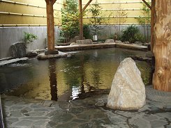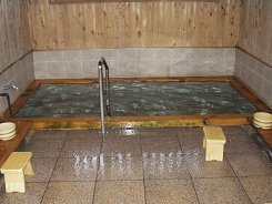 ■石和「旅館深雪温泉」 昨年4月に3つの浴場(ももの湯・柿の湯・ぶどうの湯)を新設。今回は「柿の湯」でした。内湯(石造、20人以上)と露天(岩造東屋付き、30人以上)の大きな浴槽は湯量の豊富さを感じさせます。カラン6(源泉)、シャワー・シャンプー・ドライヤーあり。土曜13時で独占〜3人と空いてました。 内湯・露天とも「完の湯」、「熟の湯」の2つの源泉を投入し、「完熟の湯」と称してます。内湯は2つの石の湯口から、それぞれ60L/mほども大量投入しながら飲泉可というのはすごい。湯船フチ全面からのオーバーフローはこれも迫力十分。 お湯は、露天・内湯ともやや緑がかった透明で弱いながらツルすべ感があり、内湯には細かい茶色の浮遊物がありました。「完の湯」には弱金気臭+微イオウ臭、弱金気味。「熟の湯」はほぼ無味無臭。「完の湯」の方が湯口の赤味も強く鉄分が多い感じ。 お湯の鮮度はスグレモノですが、個人的にはいまひとつインパクトに欠けるような気がしないでもないです。めがねさんのレポによると、内湯には黒い湯の花と硫化水素臭とあわ付きがあったとのことなので、たまたま不調だったのかもしれません。 脱衣所には、T教授の格調高い解説が掲げられています。これだけお湯にこだわった宿なのに正規の分析表が掲示されてない(?)のはちょっと不可解ですが、解説・掲示類を総合するとつぎのようです。 一号源泉「完の湯」/アルカリ性単純温泉 50.8℃、pH=8.23、573L/min自噴、Na^+=122mg/kg、Cl^-=123、SO_4^2-=42、HCO_3^-=86、メタけい酸=50 |