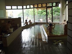 ■道志温泉「日野出屋」 午前中に訪れたためか内湯は入浴できず、国道と道志川を挟んだ対岸のキャンプ場内にある露天への入浴となりました。ここは混浴(or貸切)のようです。 ログハウス風の湯小屋のなかに脱衣所と木枠コンクリ敷4.5人の浴槽がひとつ。浴槽は小屋のなかにあり、実際は半露天ですが、目の前に川が流れていてロケはいいです。遮光されてやや暗めの落ち着いた雰囲気は、秩父の丸山鑛泉の露天風呂に似ているかな。川べりにチェアーがおいてあり、川風にあたりながらトドになることもできます。 浴槽は、樹脂製シートで保温用のフタがしてあり、これを外して入ります。コック付の金属パイプから冷水(源泉?、常閉)を投入可で、槽内排湯は不明ですが、熱湯の側面注入があったので、ふつうは溜め湯の循環かと・・・。 適温のお湯は、ほぼ無色透明で茶色の浮遊物がただよい、湯口では弱い渋味と常磐の鉱泉で感じられた漢方薬のような苦っぽい臭いがあります。弱いながらキシキシ感があり、よくあたたまり発汗します。露天に内湯と同じ源泉を使っているかは聞き忘れましたが、酸性緑礬泉にしては鉄の気配が感じられないような気もしました。 先にのぞいた「道志の湯」はバカ混みで駐車場待ち状態だったのに、ここは独占。お湯にはさほど特徴はないですが、野趣あふれる雰囲気を楽しめる穴場のお湯かと。内湯(名石風呂)は歴史を刻んだよさそうなものなので、次回は入ってみたいです。また、シシ鍋や山菜など地のものを使った料理にも自信があるようなので、泊まってみるのもいいかもしれません。 〔2004年8月レポ〕 |