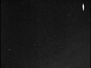 左が、ビデオカメラで捕らえた流星です。撮影には、WatecのNeptune100のモノクロ高感度CCDカメラ、レンズは6mmF0.8です。画角は、35mmレンズほどの広角になります。 当日は、午前0時25分〜1時間ほど撮影を行いました。撮影は、松山市内自宅で少しうす雲がありましたが、4等〜5等星まで見えていました。暗いものを含めると、1時間で10個ほど撮れていました。 左はその中で、最も明るく見えた流星で、午前0時34分49秒ころに出現したものです。中央少し左下が北極星。右上にカシオペヤがかすかに見えています。流星は、下から上へと飛んで行きました。 この画像は、動画から静止画を切り出し、1秒間(30コマ)を合成してt作っています。このため、あまりきれいではありません。しかし、動画の場合、空が比較的明るくても流星は十分撮影できます。 |
