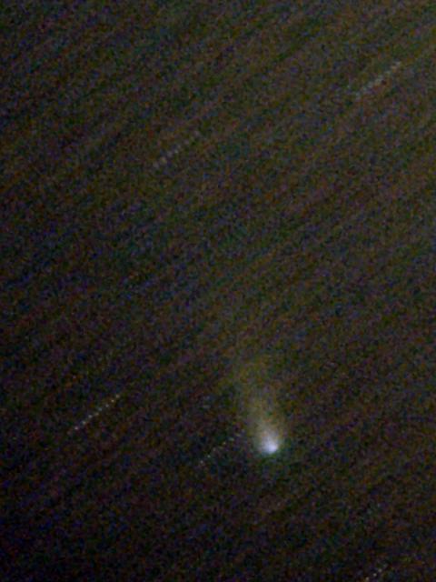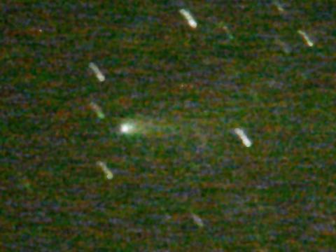 2000年7月6日のリニア彗星 1時44分〜59分までの間に、60秒露出を6コマ合成 20cm反射(R200SS)+Lv15mm+QV-3000EX、コリメ-ト撮影 フルサイズで撮影し中央部をトリミング 松山市エリエ−ルゴルフ場で撮影 この日は、透明度が悪くまた低空のため、20cmの反射で細長く延びているのが分かりましたが、詳しい明るさはよく分かりませんでした。 画像で見ると、中心の彗星から右へのびる尾が分かります。まわりの星が線上にのびているのは、彗星の動きに合わせて、6コマ合成したためです。15分ほどでこんな動いています。 ところで、デジタルカメラで初めて彗星を撮ったものです。冷却CCDほどは写りませんが、とりあえず尾まで捕らえることができました。 |