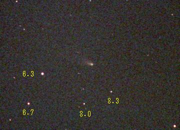 2000年7月26日のリニア彗星 20時40分〜44分までの4分露出 200mmF4 フジG-800ACE 中央部をトリミング 北条市 高縄山で撮影 この画像は、200ミリレンズの画像です。黄色の文字は、恒星の明るさで、このデ-タ-から見ると7等台の明るさのようです。ただ透明度があまりよくなく、双眼鏡で見た場合には尾は見えませんでした。 太陽に最も近づいた状態ですが明るさは、少し落ちているようです。 |