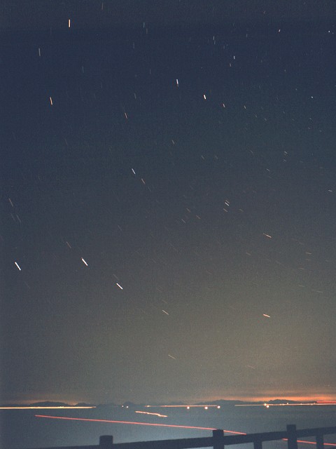 伊予灘を渡る北斗七星 1993年9月14日 21時43分〜 6分露出 双海町 潮風ふれあい公園で撮影 カメラ:フジGS645S 60mm F5.6 フィルム:フジG-400 北斗七星が、水平線のすぐ上に見えています。愛媛県で、北斗七星のうち一部の星は、海に沈んでいきますが、北の地方に出かけると、沈むことがなくなります。この写真は、沈む直前の姿です。