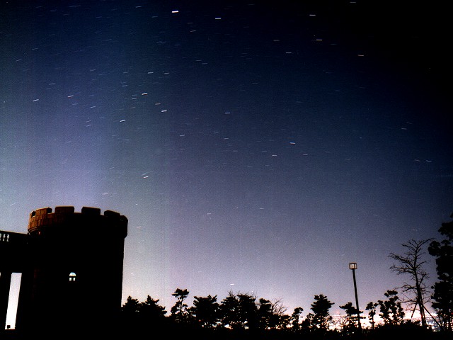 おおいぬ座〜カノ−プス 1994年1月4日 23時25分〜3分露出 松山総合公園から撮影 カメラ:マミヤM645 45mm F4 フィルム:コニカXG400 全天一明るい星が、おおいぬ座のシリウス、二番目に明るいのがカノ−プスです。展望塔の右上の明るい星がシリウス、地平線近くの星がカノ−プスです。