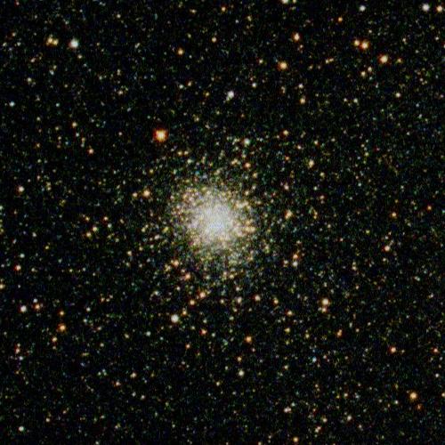 夏の星座いて座見える球状星団です。いて座方向は銀河系の中心方向に当たり、天の川がとてもよく見えます。 このため、星団のまわりのにもたくさんの星がありたいへんにぎやかです。口径が20cm以上の望遠鏡で眺めるとで、中心部 まで無数の星が見えます。 7.5cm屈折望遠鏡で撮影