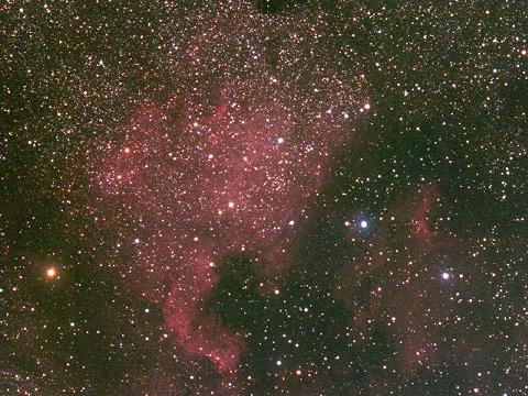 夏の星座はくちょう座にある散光星雲です。赤いガスの光がとても美しく、この星雲の形が、北アメリカ大陸そっくりなことから、この名前が付けられました。また、右下には、ペリカンの横顔の形をしたペリカン星雲も見えています。写真では、はっきりとする星雲ですが、肉眼ではこの色がほとんど感じないので、見ることは難しい星雲です。7.5cm屈折望遠鏡で撮影