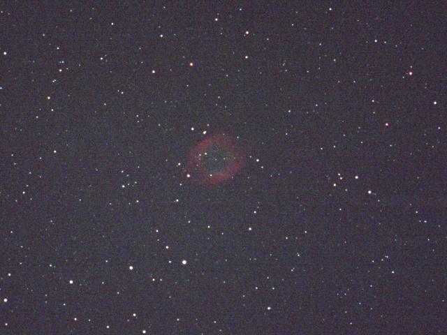 NGC7293は、惑星状星雲の中で、見かけが最も大きな天体です。ただ、あまりにも広がっているので、たいへん淡く、光害地ではたいへん見難くなります。しかし、無光害地では、双眼鏡でもその存在がわかるほどです。画像で見ると、赤い星雲がリング状に輝きたいへんきれいな天体です。 7.5cm屈折望遠鏡で撮影