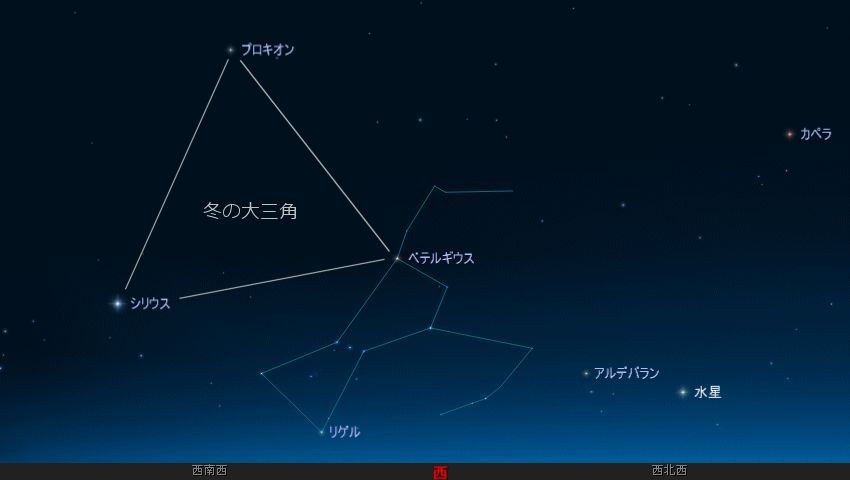 雨が上がりの透明度のいい天気でした。水星の姿も肉眼でよく分かり、夕焼けもたいへんきれいです。5/3と同じ頃の画像ですが、天気の違いでかなり星の写りが違うのが分かります。オリオン座の星も分かりますので、下のステラナビゲータで描いた図と見比べて見てください。