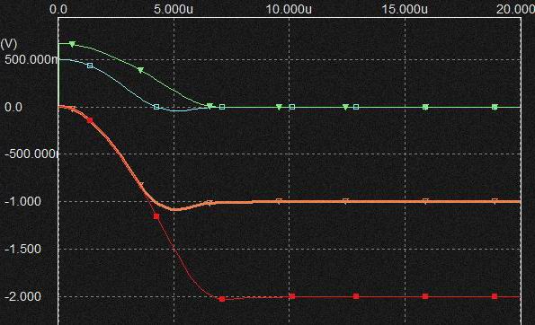 OUTPUT=0時、(+)端子に印加される電圧は同じなので Vsaも同じだが最終的には0に近づいていく。 出力電圧=2Vの場合の方が負帰還が弱いのでVsaは大きい。 出力が2倍の方が安定化するのに時間がかかる。(Through Rateが存在する) また負帰還が強いほうがover/under shootが大きい)