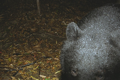 | 2001年6月15日9:30撮影 雨の中を歩いているためか,毛が濡れてばさばさしている。イヤタグは装着されておらず,未知の個体である。なぜか濁り目! |