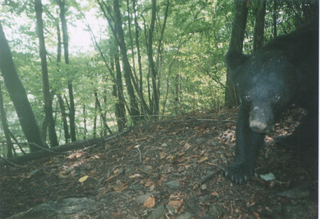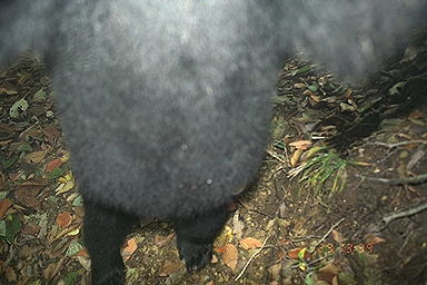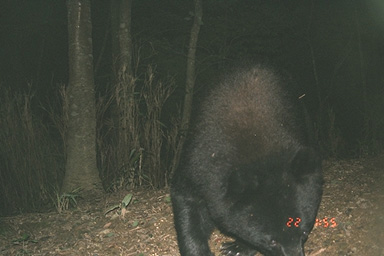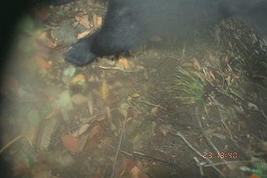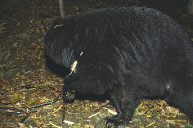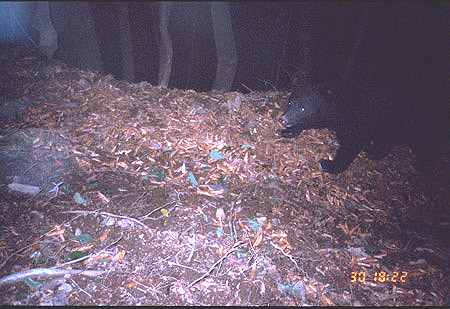 2001年7月30日18:22撮影 ストロボの光量が足りず,クマが暗く沈んでしまっている。判然とはしないものの,どうやらこの個体もイヤタグは装着していないようである。 |